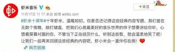 2018年11月17日,虾米音乐官方在微博发了一条动态,纪念自己十周年诞辰。不过与其五百多万的粉丝数相比,底下的评论只有寥寥数十条。