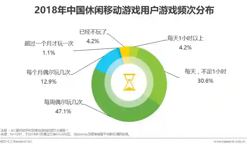游戏频次方面,市场上仅35%的用户表示自己每天都会玩休闲移动游戏,市场整体用户游戏频次较低。当然这也与休闲游戏市场定位及游戏设计普遍偏轻度有着紧密的关系。