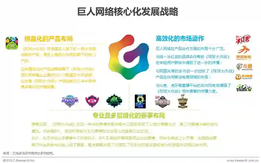 《球球大作战》是目前巨人网络在休闲移动游戏领域的核心布局产品,也是目前国内众多休闲移动电竞游戏中游戏及赛事综合影响力最强的游戏产品之一。可以认为巨人网络在休闲移动游戏领域的布局是以精品化战略为核心的,这与腾讯游戏多产品化的布局战略有着较大的区别。