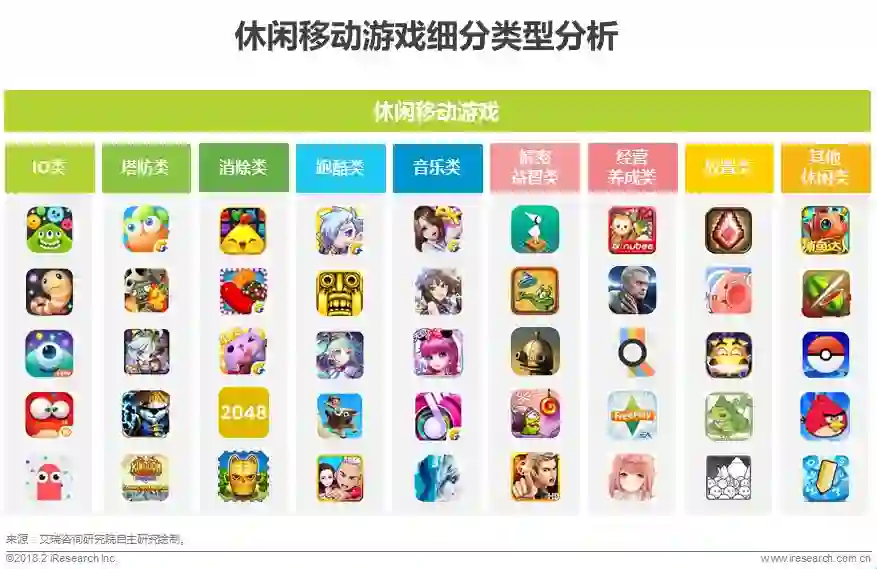 报告中所概括的休闲移动游戏类型主要包括:IO类、塔防类、消除类、跑酷类、音乐类、放置类、解密益智类及模拟经营类在内的八种游戏类型。