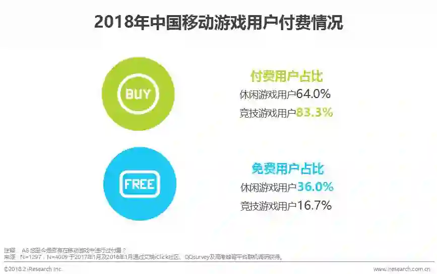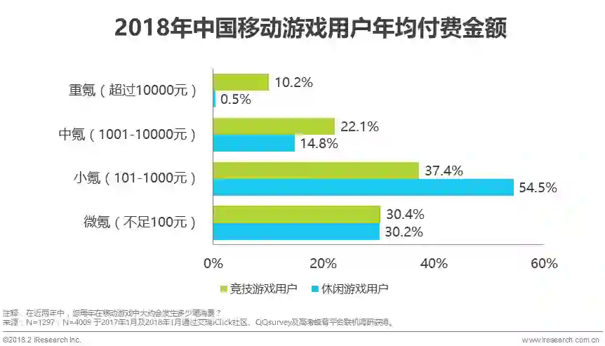 在用户付费行为方面,将国内休闲移动用户的整体付费率及玩家年均付费金额与竞技类游戏用户做直接对比后可以发现:休闲移动用户无论是在整体付费率还是在人均付费额度上的表现都要弱于竞技类移动游戏用户。休闲游戏由于整体游戏设计偏轻度,游戏中不会有太多且复杂的玩家间游戏数据的直接对比。因此,整体市场用户的消费意愿会更趋于理性。此外,与竞技类移动游戏相比,休闲移动游戏内的付费点及付费服务的投放量也会相对更少。正是在这样的市场背景之下,形成了整体休闲移动游戏市场付费用户及付费总金额相对较少的现状。