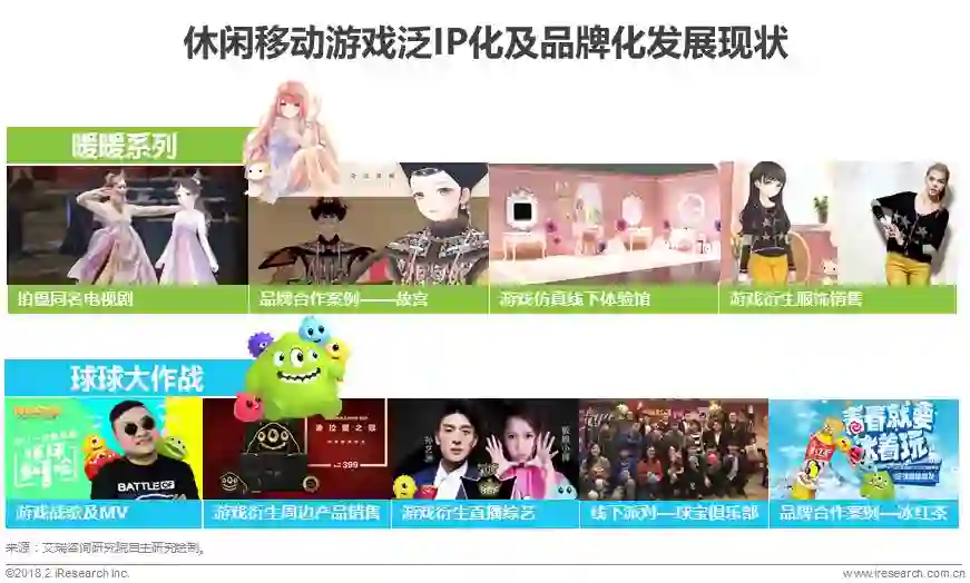 “暖暖系列”与“球球大作战”是目前国内休闲移动游戏市场中泛IP化及品牌化发展较为成功的两款游戏产品。从两款产品目前的品牌化运营布局中不难发现,整体市场已逐渐突破了以品牌合作及简单的游戏衍生品销售为主的传统品牌发展战略。转而在电视剧、线下体验馆、音乐MV及直播综艺等领域开始尝试以游戏原生IP为核心的泛IP化的品牌拓展。