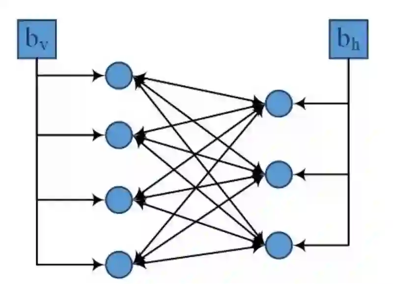 RBM 是一种随机神经网络,由两层组成,一层是包含输入的可见层,一层是含有隐变量的隐藏层。RBM 中的限制是指同一层的任意两个神经元互不相连。除此之外,偏置单元与所有的可见层和隐藏层单元都相连。