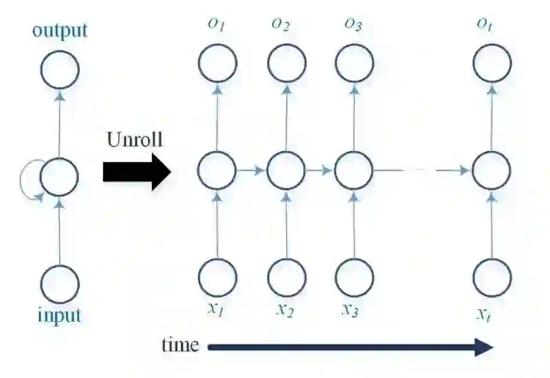 RNN 主要适用于输入为序列(例如语音和文本)或时间序列的数据(传感器数据)。RNN 的输入既包括当前样例,也包括之前观察的样例。也就是说,时间为 t-1 时 RNN 的输出会影响时间为 t 的输出。RNN 的每个神经元都有一个反馈环,将当前的输出作为下一步的输入。该结构可以解释为 RNN 的每个神经元都有一个内部存储,保留了用之前输入进行计算得到的信息。