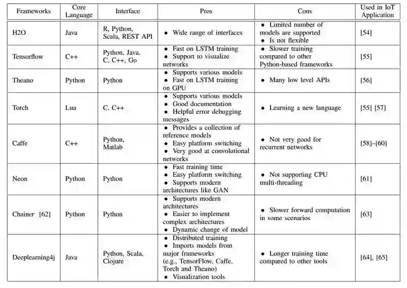 作者对于目前应用了深度学习方法的大量 IoT 应用进行了介绍,并且对不同类型的深度神经网络在各种 IoT 领域的应用进行了概括和对比。