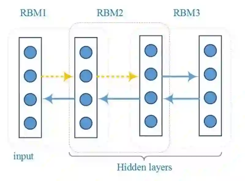 深度信念网络结构图。虚线表示特征提取通道,实现表示生成通道。DBN 是一种生成神经网络,由一个可见层可几个隐层组成。可以提取训练数据的多层表示,并且对输入数据进行重构。DBN 的训练过程是逐层训练,将每一层视作一个 RBM,在前一层的基础上进行训练。这样的机制使 DBN 成为深度学习中有效且快速的网络之一。