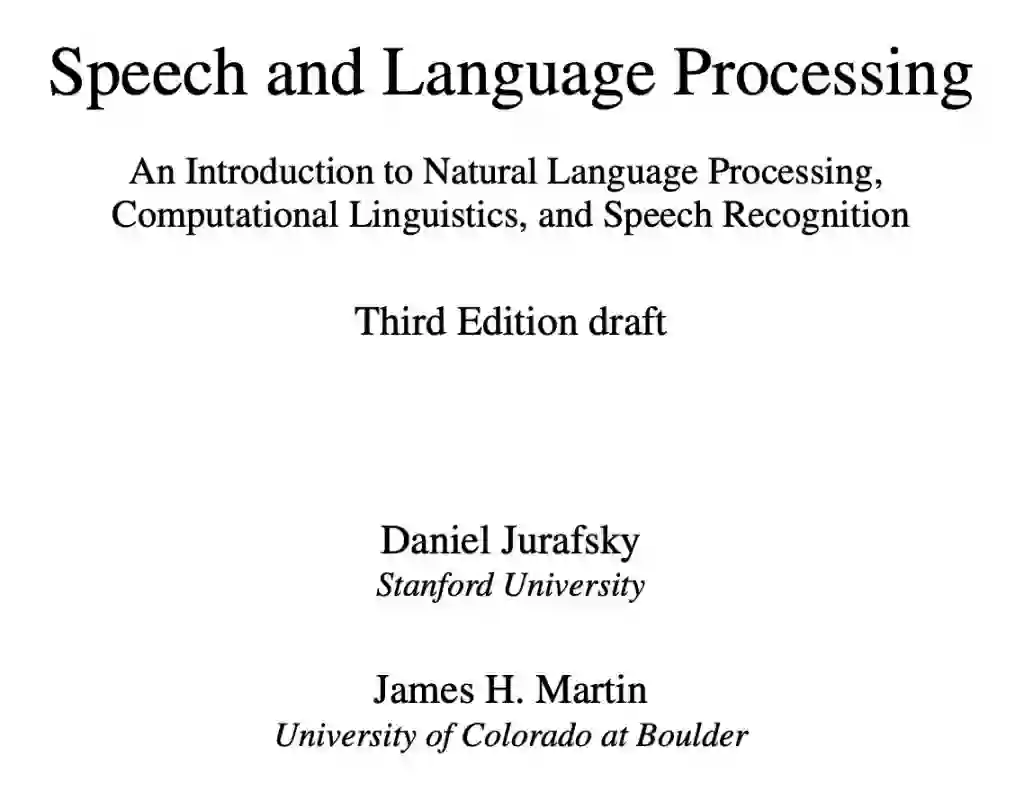 这个假期,推荐一些NLP领域的学习资源,大家可以在家里学习一下经典了。今天推荐的是自然语言处理领域的经典图书《Speech and Language Processing-An Introduction to Natural Language Processing, Computational Linguistics, and Speech Recognition》,中文译名《自然语言处理综论》,目前第三版正在撰写修订中,这本书的作者是NLP领域的大神 Daniel Jurafsky 教授和 James H. Martin 教授,原定2019年年底完工,不过目前还没有完成,但是大部分章节目前已经有草稿了,截止目前发布了一个截止2019年10月23日的单pdf文件,621页,可以在该书官网直接获取:https://web.stanford.edu/~jurafsky/slp3/