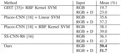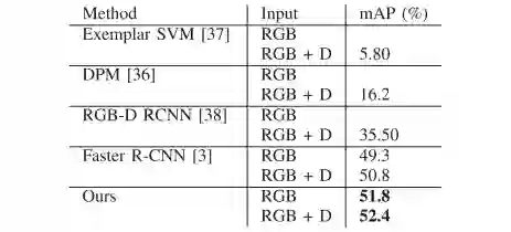 作者在SUN RGBD数据集中的19个对象类别的检测任务和19个场景类别的场景识别任务评估的提出的网络。