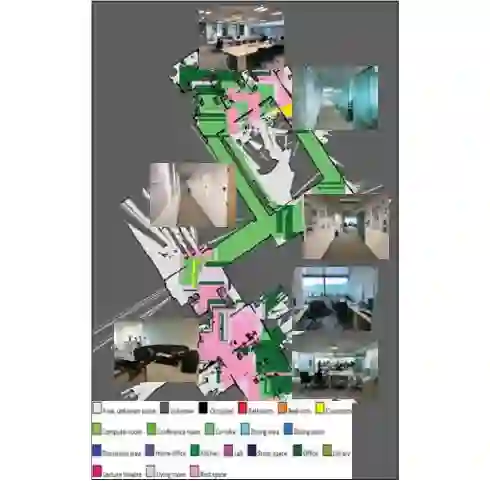 传统的机器人导航使用SLAM算法来建图,接受LiDAR输入并建立一个占用栅格地图。尽管这足以满足基本的导航任务,但是智能机器人需要对环境有更高层次的理解。由于本文的网络能够识别场景,作者提出了一个语义建图方法,接受2D LiDAR和相机图像输入,将空间划分为具体的语义概念如办公室,起居室和走廊等,在建图过程中传统的占用栅格地图和语义地图同时构建。