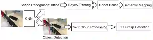 本系统主要有三个关键部分:一个用于场景理解和对象检测的多任务CNN;一个用于语义建图的置信度更新系统;一个将2D检测结果扩展到3D空间用于抓取的点云处理流程。