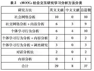 由于学习分析方法在xMOOCs社会交互研究方法中所占比重最大,本文对表1中采用学习分析方法的37篇文献按具体研究方法类型进行了分类汇总,如表2所示。