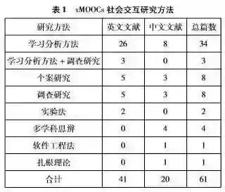 在上述检索结果的基础上,根据以下策略剔除不相关文献:(1)研究对象不符合xMOOCs内涵;(2)未包含与社会交互相关的研究内容。在浏览和初步研读相关文献后,共保留61篇文献(其中中文20篇,英文41篇)纳入分析范围。