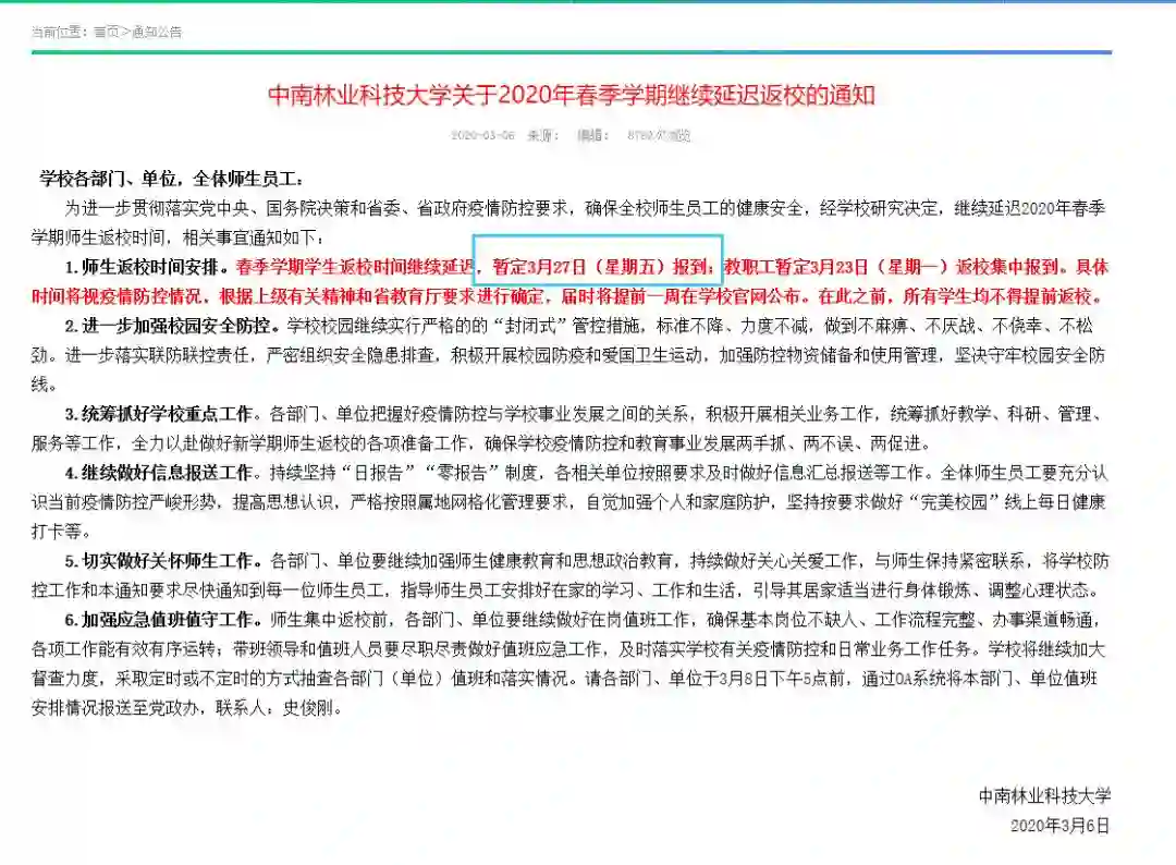 学生返校方面,中南林业科技大学是目前为数不多的给出具体学生返校时间的高校。3月6日,中南林业科技大学发布了2020年春季学期继续延期返校的通知。学校暂定学生返校报到时间为3月27日(下周五),教职工返校时间则暂定为3月23日(下周一),通知也提到,具体时间将视疫情防控情况确定,提前一周在学校官网公布。