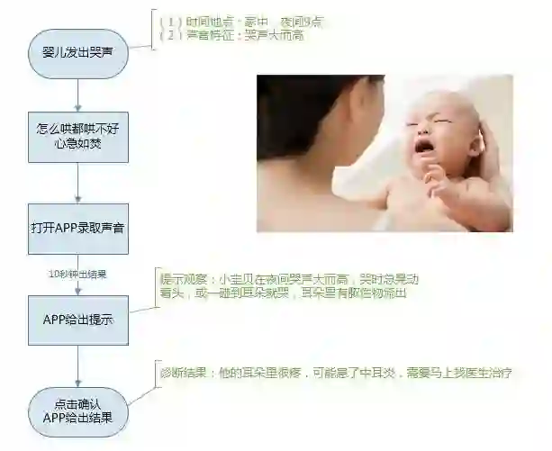 上图描述了一个模拟场景:家长先通过APP锁定原因范围,再根据APP的提示观察婴儿,给出判断。