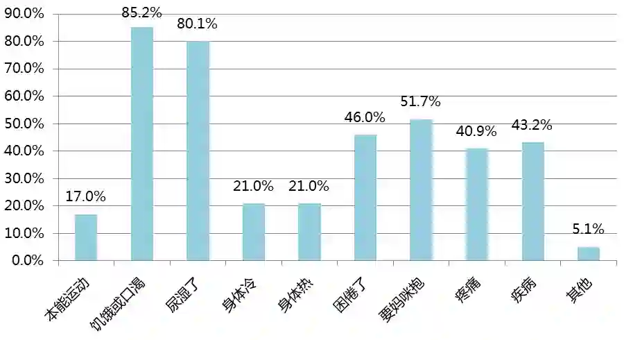 覆盖度:调研中设定的9种原因已经覆盖了95%的情况,排名最高的6种是饥饿口渴、尿布湿、要抱抱、困了、疾病和疼痛。另有5%的父母选择了其他原因,包括受到惊吓、身体被挤压等,这些原因可以通过一进步的调研来补全。