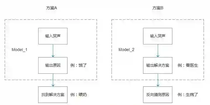 现实中“啼哭原因”与“解决方案”是多对多的复合因果关系,如果直接取哭声+有效方案来拟合模型,可能最终效果相同甚至更好。