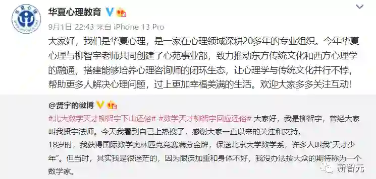 在这里,柳智宇作为事业部部长,带领十余人,创办了一个名为「华夏心苑」的小团队,据华夏心理方面的介绍,「华夏心苑」的目标是致力推动东方传统文化和西方心理学的融通,搭建能够培养心理咨询师的闭环生态。