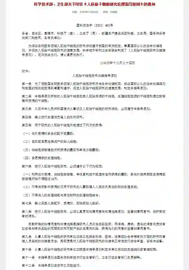同时,2003 年我国科技部和卫生部印发的《人胚胎干细胞研究伦理指导原则》更是明确,在进行人胚胎干细胞研究,必须遵守以下行为规范: