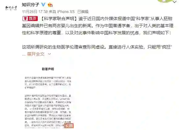 “鉴于近日国内外媒体报道中国“科学家”从事人胚胎基因编辑并已有两名婴儿出生的新闻。作为中国普通学者,出于对人类的基本理性和科学原理的尊重,以及对此事件影响中国科学发展的忧虑,我们声明如下: