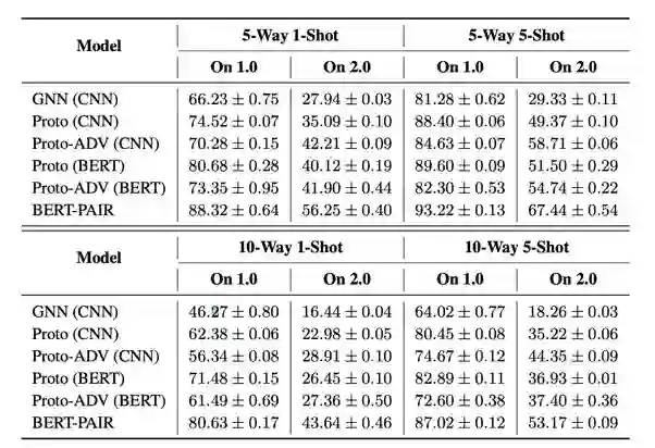▲ FewRel 1.0和FewRel 2.0测试结果对比,可看出跨领域任务十分具有挑战性