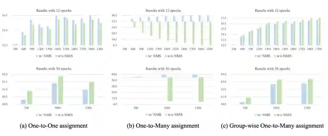 我们再看一对多标签分配,如上图(b)所示。在这里需要做一下说明,这个实验中,如果使用 600 query,那么每个 ground truth 会被分配给 2 个不同的 positive query,依次类推。我们发现,当提升 query 的数量到 3300,性能获得了接近 6 个点的提升,非常显著。这其实也反映了一个现象:多个 positive query 能显著加快 DETR 的收敛。