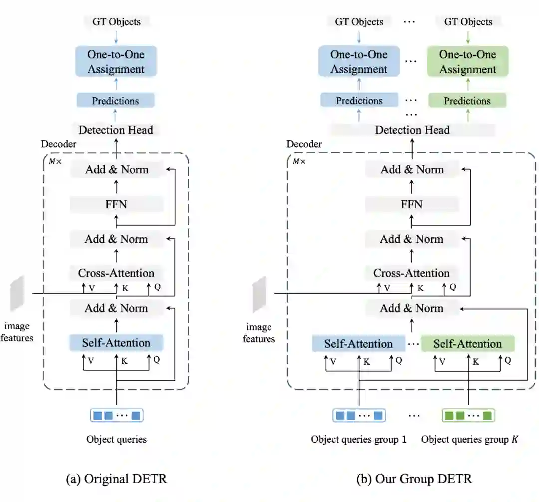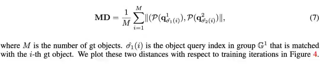但上述一对多标签分配算法也存在一些问题。(1)该算法容易产生 duplicate prediction,需要 NMS 来去重。如果我们在测试时去掉 NMS,那么性能会以非常恐怖的幅度下降,且 query 数量越多,duplicate 程度就越高,性能下降地越厉害:使用 3300 query 时,性能下降大概 30 个点。(2)该算法带来较大的计算开销。训练时使用 3300 query,那么测试的时候也需要使用 3300 query,相比于 baseline(300 query),decoder 的计算量提高到了 11 倍。