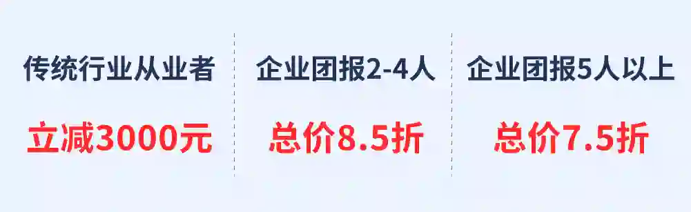 传统行业从业者,还可获得立减3000元的优惠。传统行业包括但不限于:航天、石油、核电、化工、电力、制造、建筑、交通、物流、机械、医药、材料等等。
