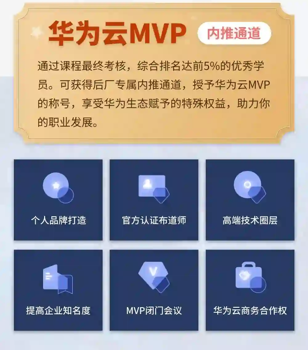 培养方案最终会进行学员排名,优秀学员可获得华为云MVP内推特权和HDG:华为开发者汇线下沙龙交流资格。