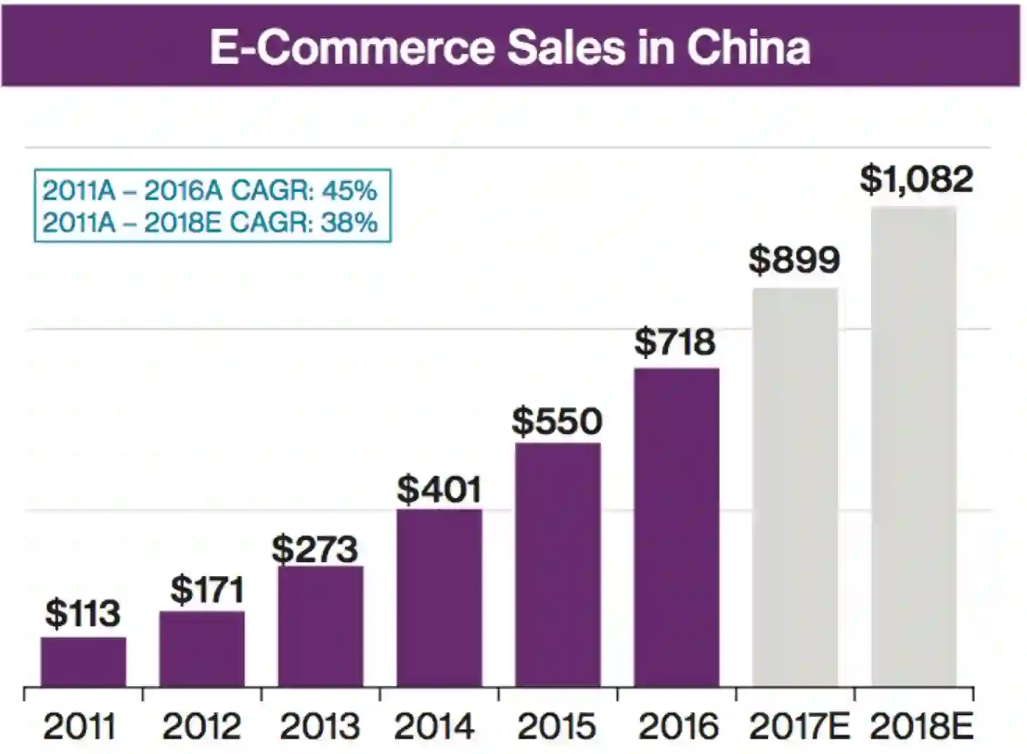 电子商务可能是审视亚洲新兴市场与全球发达的保险市场之间差距逐渐缩小的最佳角度。下面的图说明了亚洲新兴电子商务在全球的领先地位。中国的电子商务市场自2011年以来已经以45%的复合年增长率增长,到2018年预计整体规模将超过1万亿美元。