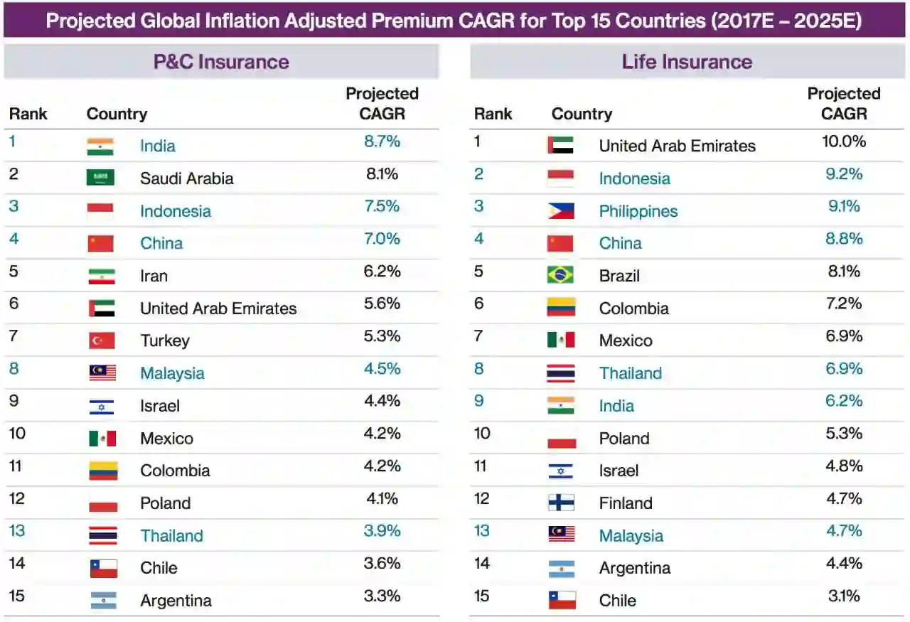亚洲新兴市场的代表是中国,中国已经步入全球第三大保险市场。其他国家还包括印度、印尼、马来西亚和泰国等。从2017年到2025年,这些国家的保费增长CAGR都保持在5%以上。