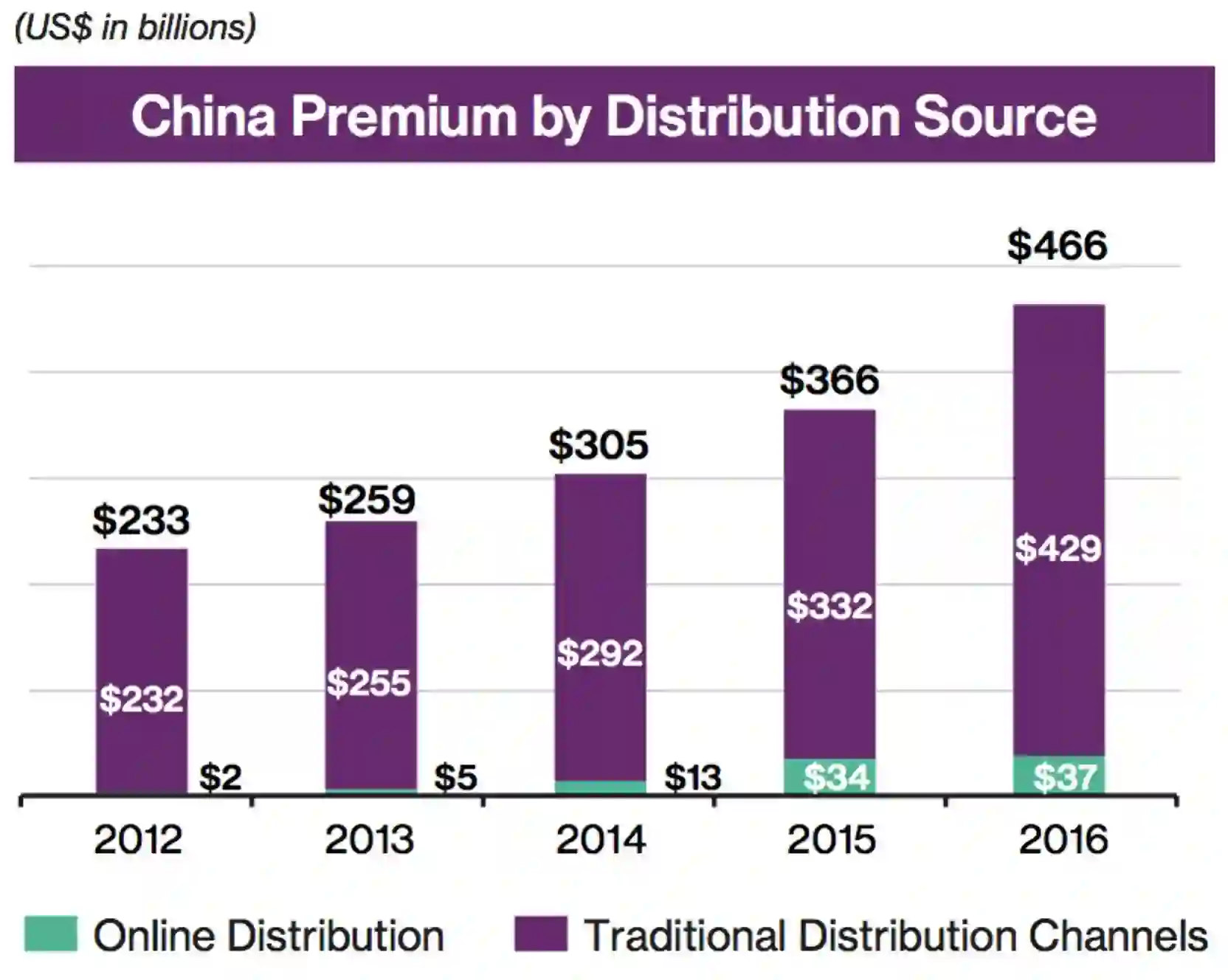 中国和亚洲新兴市场的保险业销售渠道一直集中在专属代理和银保渠道。2016年,这两个分销渠道的销售额合计占中国保费总额的92%,较2012年的99%有所下降。