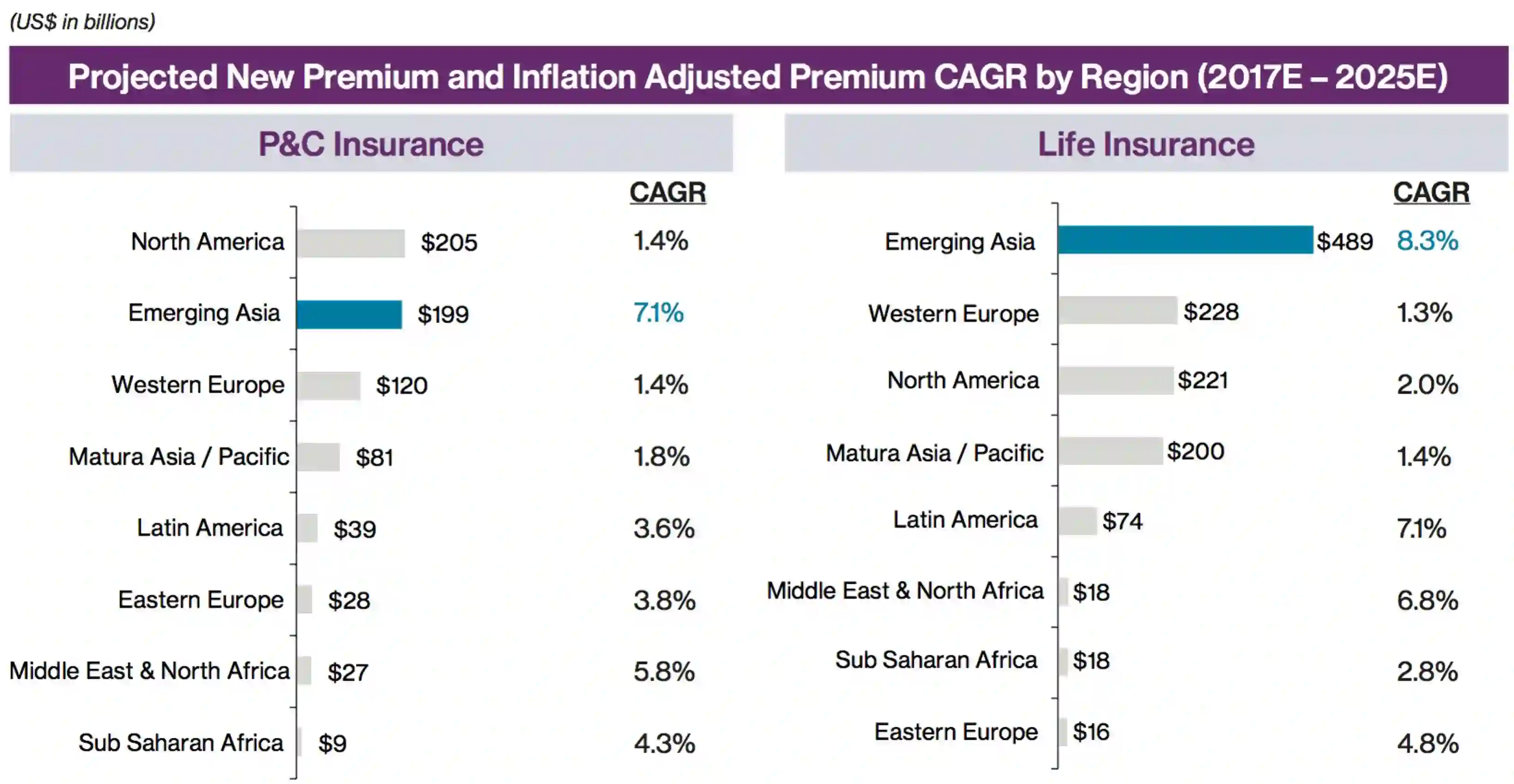 从2016年开始,亚洲新兴市场成为全球保险市场增长最显著的地区,寿险和财险的保费分别上升了27%和7%。虽然亚洲新兴市场的(再)保险保费自2007年开始的年复合增长率(CAGR)已达15%,但渗透率仍然落后于发达国家,这意味着保费的增长会持续。因此,预计到2025年,亚洲新兴市场的保费收入(财险和寿险两个方面)仍然会持续增长。
