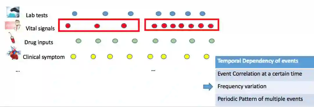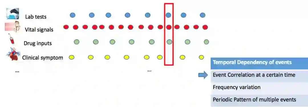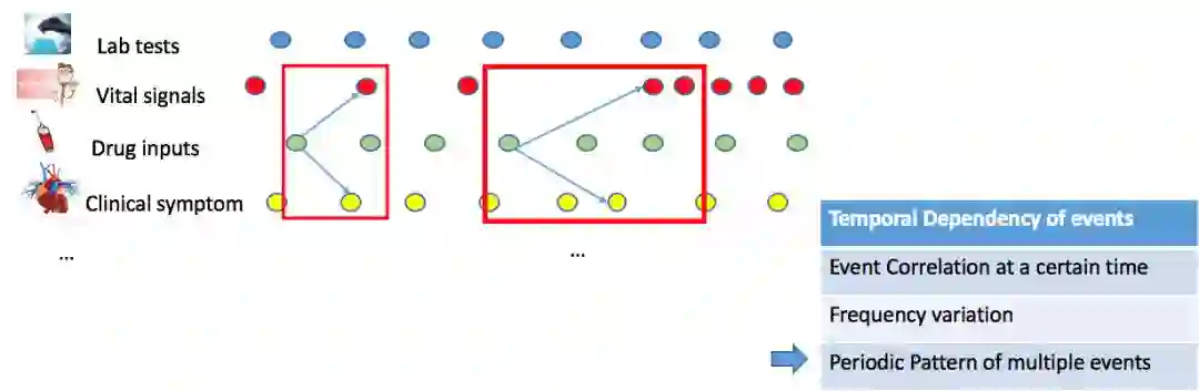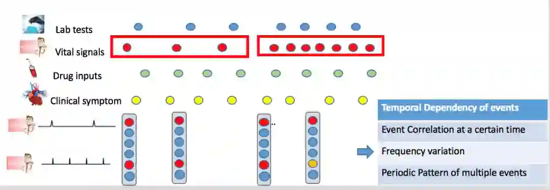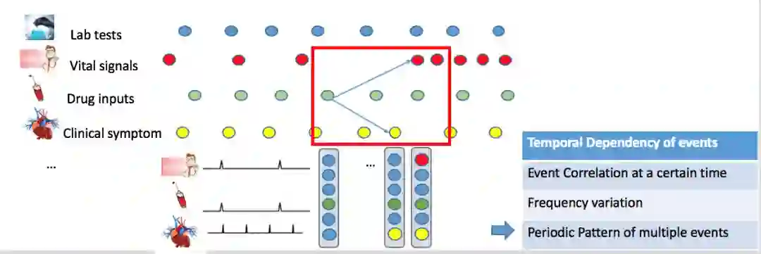 我们首先需要分析医疗事件数据特点以及性质。电子病历记录可以抽象成上千种带有时序信息相互关联的医疗事件,不仅上千种事件之间有不同的记录频率,相同类型的事件由于其事件属性不同,也有很大差异。比如药物注射事件就包含药剂类型、剂量、注射速率三个属性;化验事件的属性包括化验异常与否、指标的值这两个属性。