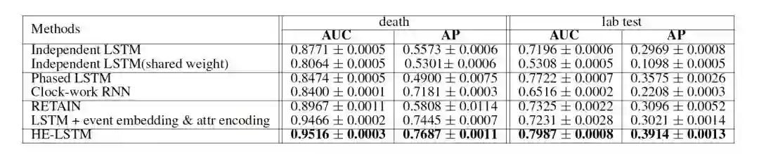 在死亡预测和钾离子化验异常预测任务中,相比于单独对各个数据源进行序列建模的模型和延迟更新的RNN模型,以及异构序列模型,异构事件LSTM(HE-LSTM)在AUC和AP上都有更好的表现。