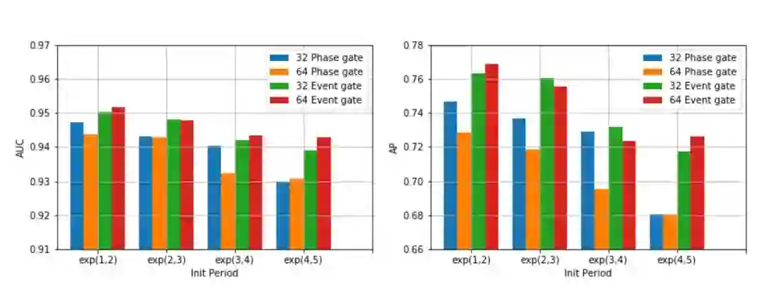 本文使用不同的采样周期去初始化模型,可以发现异构事件LSTM由于时间过滤器的加入,提升了模型的鲁棒性,在不同的初始化条件下测试集AUC和AP表现保持得比较稳定。