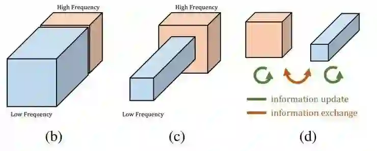 如上方图 1 - (a) 所示,一张自然图像可以被分解为低空间频率部分和高空间频率部分,前者描述了平滑变化的结构,后者描述了快速变化的图像细节。与之类似,论文作者们提出卷积层的特征图输出也可以被分解为具有不同空间频率的部分,并提出了一个新的多频率特征表征,它在不同的组中分别存储高频和低频的特征图,如图 1 - (b) 所示。这样,低频组的空间分辨率就可以安全地降低,通过在相邻的位置之间共享信息的方式降低空间冗余度,如图 1 - (c) 所示。为了与这种新的特征表示方法相容,作者们从原始的卷积操作进行了泛化,提出了 Octave Convolution (OctConv),它的输入是含有高低不同频率张量的特征图,然后直接从低频的特征图中提取信息,不需要把它解码回高频,如图 1 - (d) 所示。