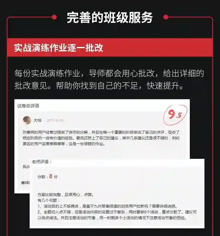 幻想无数,不如动次真格。看的再多,不如动手做做。每个板块的课程的刚开始都会预先布置一个实战课题。充分预知课题后,带着问题参与学习,才能到达更好的学习效果。每一份作业,都会由授课老师亲自批改、打分、写下评语和修改建议。