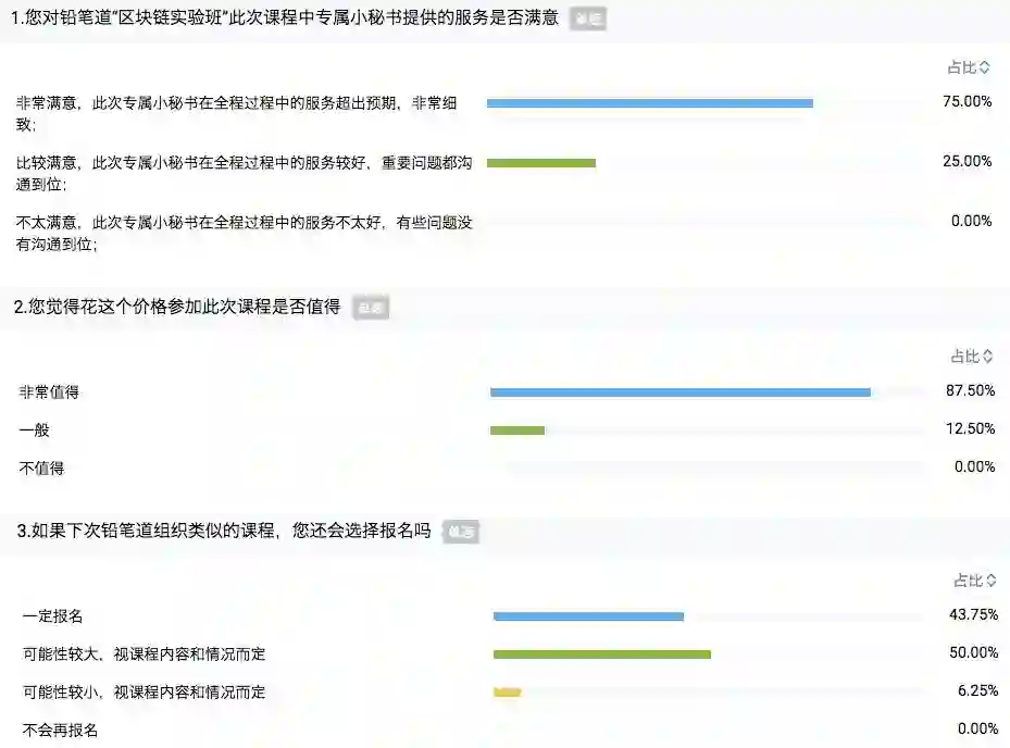 课后,我们做了一次小调研。从反馈来看,100%的学员事后表示课程值得上,其中约87%认为非常值得。100%的学员为秘书们的服务勾选了满意和非常满意。约94%的同学愿意再次报名,其中约44%表示一定报名。