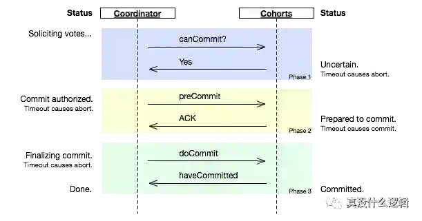 当参与者向协调者发送 ACK 后,如果长时间没有得到协调者的响应,在默认情况下,参与者会自动将超时的事务进行提交,不会像两阶段提交中被阻塞住;上述的图片非常清楚地说明了在不同阶段,协调者或者参与者的超时会造成什么样的行为。