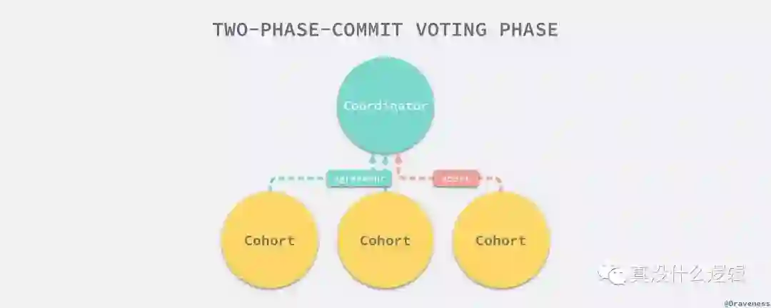 两阶段提交的执行过程就跟它的名字一样分为两个阶段,投票阶段和提交阶段,在投票阶段中,协调者(Coordinator)会向事务的参与者(Cohort)询问是否可以执行操作的请求,并等待其他参与者的响应,参与者会执行相对应的事务操作并记录重做和回滚日志,所有执行成功的参与者会向协调者发送 AGREEMENT 或者 ABORT 表示执行操作的结果。