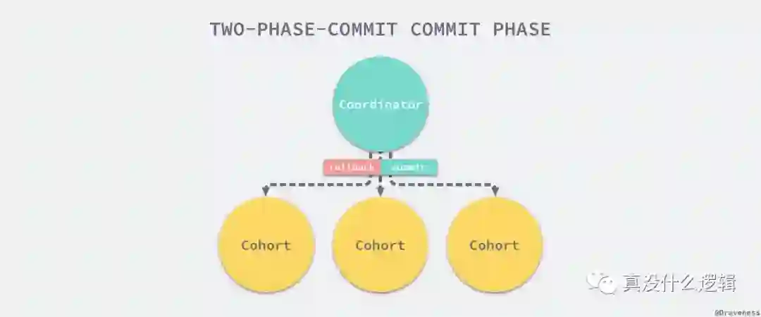 当事务的所有参与者都决定提交事务时,协调者会向参与者发送 COMMIT 请求,参与者在完成操作并释放资源之后向协调者返回完成消息,协调者在收到所有参与者的完成消息时会结束整个事务;与之相反,当有参与者决定 ABORT 当前事务时,协调者会向事务的参与者发送回滚请求,参与者会根据之前执行操作时的回滚日志对操作进行回滚并向协调者发送完成的消息,在提交阶段,无论当前事务被提交还是回滚,所有的资源都会被释放并且事务也一定会结束。