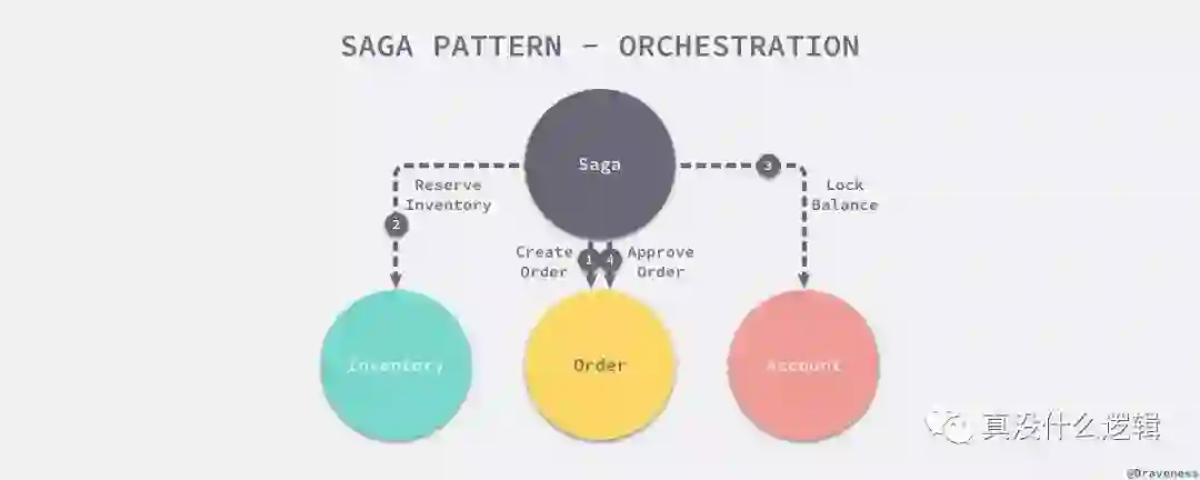 在这里我们就引入了一个中心化的『协调器』,它会保存当前分布式事务进行到底的状态,并根据情况对事务进行回滚或者提交操作,在服务编排的过程中,我们是从协调者本身触发考虑整个事务的执行过程的,相对于协同的方式,编排实现的过程相对来说更为简单。