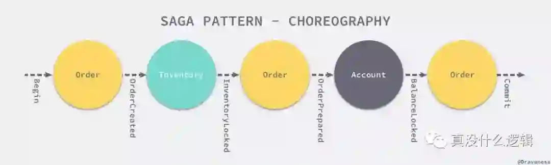 如果对于一个分布式事务,我们采用协同的方式进行开发,每一个本地的事务都会触发一个其他服务中的本地事务的执行,也就是说事务的执行过程是一个流的形式进行的: