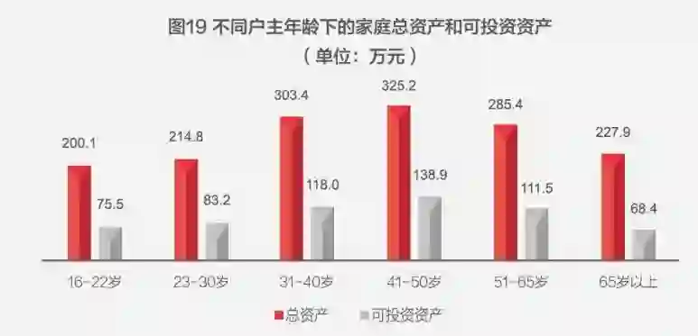 户主年龄在41-50岁时家庭的总资产和可投资资产最高,分别为325.2万元和138.9万元。