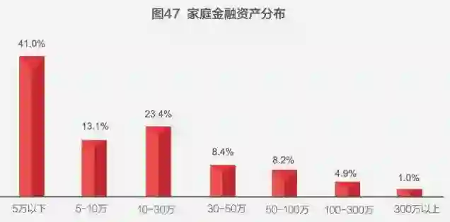 这和家庭金融资产的分布有关,41%的家庭金融资产在5万元以下,13.1%在5-10万元之间,23.4%在10-30万之间,30万以上的仅22.5%。