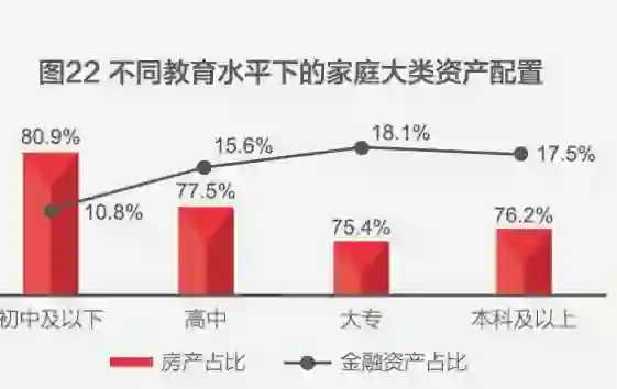 家庭的房产占比基本随着户主受教育水平的提高而降低,学历为初中及以下的家庭,房产占比高达80.9%;高于本科及以上的学历家庭76.2%的占比。