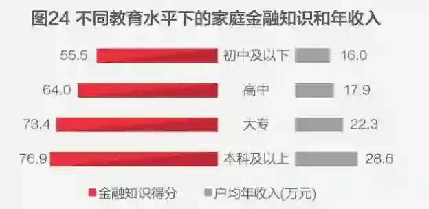 如本科及以上的家庭,户均年收入为28.6万元,金融知识得分76.9分;而初中及以下的家庭,户均年收入则为16万元,金融知识得分55.5分。