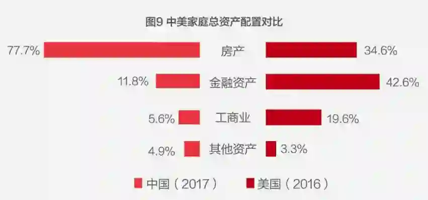 家庭总资产中,房产的占比最高。2017年,中国我国家庭总资产中,房产占比高达77.7%,远高于美国的34.6%。