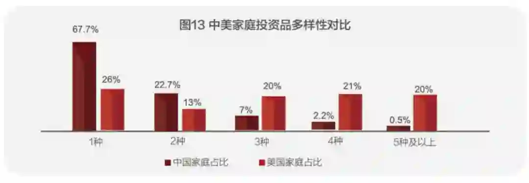 有67.7%的中国城市家庭仅拥有一种投资品,拥有2种的为22.7%,拥有3种以上的仅10.6%,而美国拥有3种及以上投资品的家庭占比达到了61%。