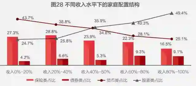 这和不同收入水平下的家庭配置结构相一致:收入越高,货币配置占比越低,股票占比越高。
